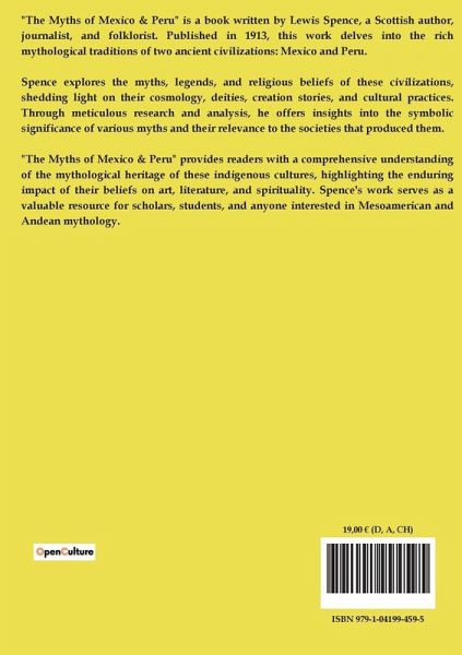 "The Myths of Mexico & Peru" is a book written by Lewis Spence, a Scottish author, journalist, and folklorist. Published in 1913, this work delves into the rich mythological traditions of two ancient civilizations: Mexico and Peru. Spence explores the myths, legends, and religious beliefs of these civilizations, shedding light on their cosmology, deities, creation stories, and cultural practices. Through meticulous research and analysis, he offers insights into the symbolic significance of various myths and their relevance to the societies that produced them. "The Myths of Mexico & Peru" provides readers with a comprehensive understanding of the mythological heritage of these indigenous cultures, highlighting the enduring impact of their beliefs on art, literature, and spirituality. Spence's work serves as a valuable resource for scholars, students, and anyone interested in Mesoamerican and Andean mythology.