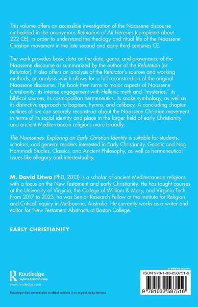 The work provides basic data on the date, genre, and provenance of the Naassene discourse as summarized by the author of the Refutation (or Refutator). It also offers an analysis of the Refutator's sources and working methods, an analysis which allows for a full reconstruction of the original Naassene discourse. The book then turns to major aspects of Naassene Christianity: its intense engagement with Hellenic myth and "mysteries," its biblical sources, its cosmopolitan hermeneutics, its snake symbology, as well as its distinctive approach to baptism, hymns, and celibacy. A concluding chapter outlines all we can securely reconstruct about the Naassene Christian movement in terms of its social identity and place in the larger field of early Christianity and ancient Mediterranean religions more broadly.