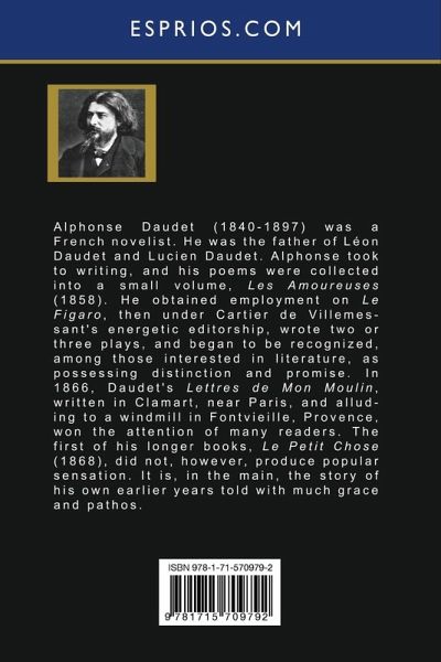 Alphonse Daudet (1840-1897) was a French novelist. He was the father of Léon Daudet and Lucien Daudet. Alphonse took to writing, and his poems were collected into a small volume, Les Amoureuses (1858). He obtained employment on Le Figaro, then under Cartier de Villemessant's energetic editorship, wrote two or three plays, and began to be recognized, among those interested in literature, as possessing distinction and promise. In 1866, Daudet's Lettres de Mon Moulin, written in Clamart, near Paris, and alluding to a windmill in Fontvieille, Provence, won the attention of many readers. The first of his longer books, Le Petit Chose (1868), did not, however, produce popular sensation. It is, in the main, the story of his own earlier years told with much grace and pathos.