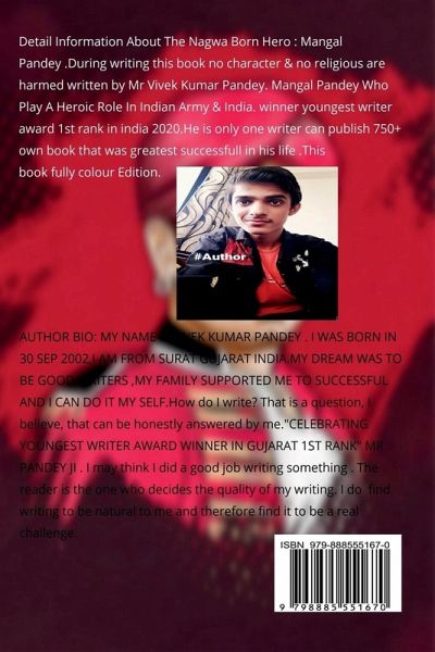 Detail Information About The Nagwa Born Hero : Mangal Pandey .During writing this book no character & no religious are harmed written by Mr Vivek Kumar Pandey. Mangal Pandey Who Play A Heroic Role In Indian Army & India. winner youngest writer award 1st rank in india 2020.He is only one writer can publish 750+ own book that was greatest successfull in his life .This book fully colour Edition.