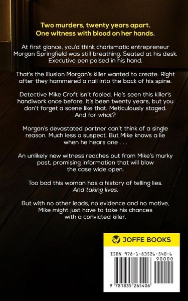 A heart-pounding new British crime thriller, full of stunning twists. Two murders, twenty years apart. One witness with blood on her hands. At first glance, you'd think charismatic entrepreneur Morgan Springfield was still breathing. Seated at his desk. Executive pen poised in his hand. That's the illusion Morgan's killer wanted to create. Right after they hammered a nail into the back of his spine. Detective Mike Croft isn't fooled. He's seen this killer's handiwork once before. It's been twenty years, but you don't forget a scene like that. Meticulously staged. And for what? Morgan's devastated partner can't think of a single reason. Much less a suspect. But Mike knows a lie when he hears one . . . An unlikely new witness reaches out from Mike's murky past, promising information that will blow the case wide open. Too bad this woman has a history of telling lies. And taking lives. But with no other leads, no evidence and no motive, Mike might just have to take his chances with a convicted killer. CWA Dagger-nominated Jane Adams is back, with her most fiendishly twisty mystery yet. Fans of Simon McCleave, Joy Ellis, Helen H. Durrant, J.D. Kirk, Elly Griffiths, Rachel McLean and Tana French will devour this utterly unputdownable Norfolk-based mystery.