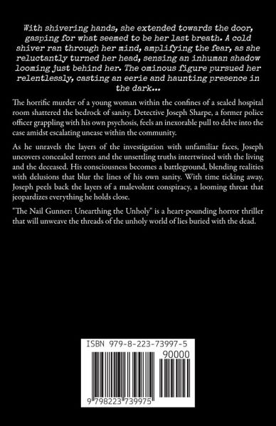 Unholy shadows Megan dragged herself across the floor, soaked in blood, desperately attempting to escape the confines of her hospital room. Her fingers strained towards the doorknob, hands outstretched in a desperate reach. Numbness crept through her legs, inducing panic attacks as she fought to escape someone in her room. With shivering hands, she extended towards the door, gasping for what seemed to be her last breath. A cold shiver ran through her mind, amplifying the fear, as she reluctantly turned her head, sensing an inhuman shadow looming just behind her. The ominous figure pursued her relentlessly, casting an eerie and haunting presence in the dark... The horrific murder of a young woman within the confines of a sealed hospital room shattered the bedrock of sanity. Detective Joseph Sharpe, a former police officer grappling with his own psychosis, feels an inexorable pull to delve into the case amidst escalating unease within the community. As he unravels the layers of the investigation with unfamiliar faces, Joseph uncovers concealed terrors and the unsettling truths intertwined with the living and the deceased. His consciousness becomes a battleground, blending realities with delusions that blur the lines of his own sanity. With time ticking away, Joseph peels back the layers of a malevolent conspiracy, a looming threat that jeopardizes everything he holds close. "The Nail Gunner: Unearthing the Unholy" is a heart-pounding horror thriller that will unweave the threads of the unholy world of lies buried with the dead.