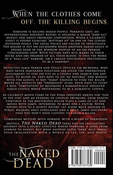 When the clothes come off, the killing begins. Someone is killing naked people. Paradise Lost, an international naturist resort is holding a major "bare all" nudist and adult swingers convention. When a celebrity guest is found floating "bottoms up" in one of the luxury outdoor pools, the local police are called to investigate. The resort is put on lockdown when another naked guest is found dead in the window display of an on-premise concessions shop. Both victims have bite marks in their necks and are drained of all their blood. Is this the work of a "real life" vampire, or a crazed psychopath pretending to be a vampire? Detective Jamie Parker and Police Officer Jim McKenna, who have never worked together are given the undercover assignment to stay on site as a couple and search for any clues. To blend in, they have to go "au natural" and mingle with the guests. Unexpectedly, if not "hard" enough to find the killer, both have to fight the "temptation" of becoming a romantically involved naked couple while pretending to be a romantic couple. As celebrity movie stars in the porn industry arrive for "fun in the sun" and an evening of couples swinging, more mysterious deaths continue as the killer plays a game of cat and mouse with Jamie, intending to make her a victim. Never having been to a nudist resort, let alone walk around in public wearing only sunglasses and a smile, Jamie discovers that you don't need clothes to catch a killer. Combining mystery with horror, with a blend of forbidden erotica, The Naked Dead is a compelling journey into a secret lifestyle where everyone is nude from sunrise to sunset. But what happens after "dark" will haunt your imagination with a world of sex, sin, and death.