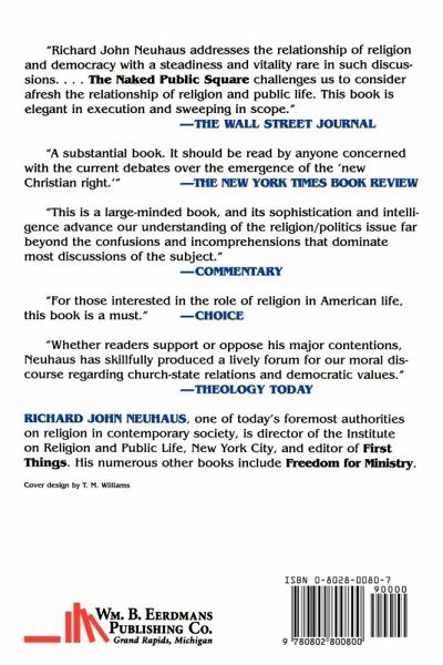 Underlying the many crises in American life, writes Richard John Neuhaus, is a crisis of faith. It is not enough that more people should believe or that those who believe should believe more strongly. Rather, the faith of persons and communities must be more compellingly related to the public arena. "The naked public square"--which results from the exclusion of popular values from the public forum--will almost certainly result in the death of democracy. The great challenge, says Neuhaus, is the reconstruction of a public philosophy that can undergird American life and America's ambiguous place in the world. To be truly democratic and to endure, such a public philosophy must be grounded in values that are based on Judeo-Christian religion. The remedy begins with recognizing that democratic theory and practice, which have in the past often been indifferent or hostile to religion, must now be legitimated in terms compatible with biblical faith. Neuhaus explores the strengths and weaknesses of various sectors of American religion in pursuing this task of critical legitimation. Arguing that America is now engaged in an historic moment of testing, he draws upon Protestant, Catholic, and Jewish thinkers who have in other moments of testing seen that the stakes are very high--for America, for the promise of democratic freedom elsewhere, and possibly for God's purpose in the world. An honest analysis of the situation, says Neuhaus, shatters false polarizations between left and right, liberal and conservative. In a democratic culture, the believer's respect for nonbelievers is not a compromise but a requirement of the believer's faith. Similarly, the democratic rights of those outside the communities of religious faith can be assured only by the inclusion of religiously-grounded values in the common life. The Naked Public Square does not offer yet another partisan program for political of social change. Rather, it offers a deeply disturbing, but finally hopeful, examination of Abraham Lincoln's century-old question--whether this nation or any nation so conceived and so dedicated can long endure.