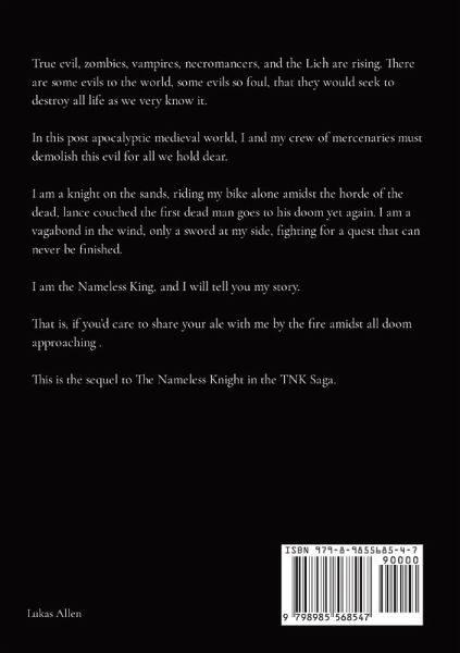 True evil, zombies, vampires, necromancers, and the Lich are rising. There are some evils to the world, some evils so foul, that they would seek to destroy all life as we very know it. In this post apocalyptic medieval world, I and my crew of mercenaries must demolish this evil for all we hold dear. I am a knight on the sands, riding my bike alone amidst the horde of the dead, lance couched the first dead man goes to his doom yet again. I am a vagabond in the wind, only a sword at my side, fighting for a quest that can never be finished. I am the Nameless King, and I will tell you my story. That is, if you'd care to share your ale with me by the fire amidst all doom approaching . This is the sequel to The Nameless Knight in the TNK Saga.