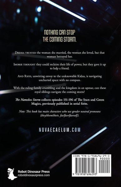 NOTHING CAN STOP THE COMING STORM. Dressa trusted the woman she married, the woman she loved, but that woman betrayed her. Imorie thought they could reclaim their life of power, but they gave it up to help a friend. And Rhys, unwitting envoy to the unknowable Kidaa, is navigating uncharted space with no compass. With the ruling family crumbling and the kingdom in an uproar, can these royal siblings navigate the coming storm? The Nameless Storm collects episodes 151-195 of The Stars and Green Magics, previously published in serial form. Note: This book has main characters who use gender-neutral pronouns (they/them/their, fae/faer/faerself).