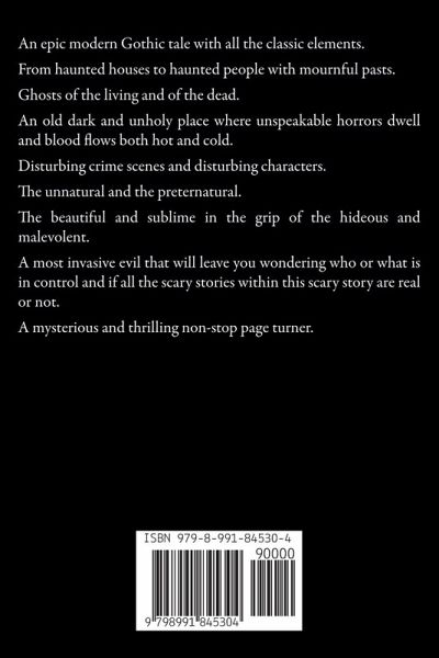 A modern Gothic tale with all the classic elements. From haunted houses to haunted people with mournful pasts. Ghosts of the living and the dead. An old dark and unholy place where unspeakable horrors dwell and blood flows both hot and cold. Disturbing crime scenes and disturbing characters. The unnatural and the preternatural. The beautiful and sublime in the grip of the hideous and malevolent. A most invasive evil that will leave you wondering who or what is in control and if all the scary stories within this scary story are real or not. ¿¿¿¿¿¿¿A fast paced mysterious and thrilling non-stop page turner.