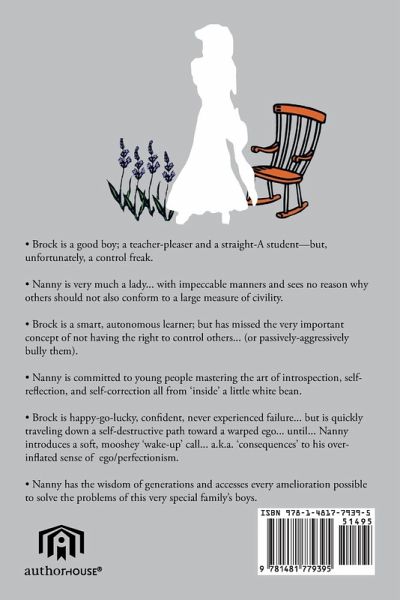 ¿ Brock is a good boy; a teacher-pleaser and a straight-A student-but, unfortunately, a control freak. ¿ Nanny is very much a lady... with impeccable manners and sees no reason why others should not also conform to a large measure of civility. ¿ Brock is a smart, autonomous learner; but has missed the very important concept of not having the right to control others... (or passively-aggressively bully them). ¿ Nanny is committed to young people mastering the art of introspection, self-reflection, and self-correction. ¿ Brock is happy-go-lucky, confident, never experienced failure... but is quickly traveling down a self-destructive path toward a warped ego... until... Nanny introduces a soft, mooshey 'wake-up' call... a.k.a. 'consequences' to his over-inflated sense of self. ¿ Nanny has the wisdom of generations and accesses every amelioration possible to solve this family's problems.