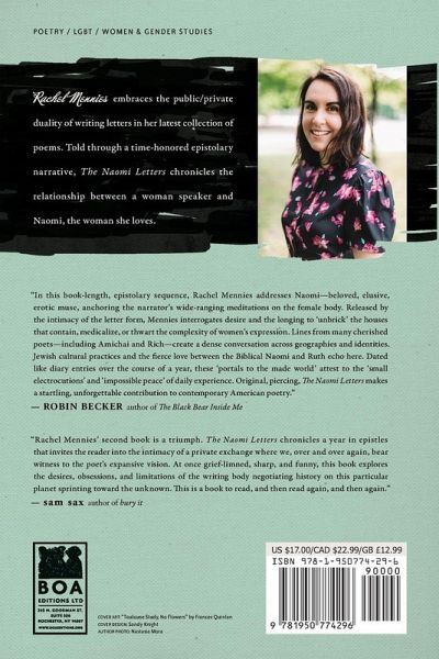 Rachel Mennies is the author of The Naomi Letters (BOA Editions, 2021) and The Glad Hand of God Points Backwards (Texas Tech University Press, 2014), winner of the Walt McDonald First-Book Prize in Poetry and finalist for a National Jewish Book Award. Her poems and essays have been published at The Believer, American Poetry Review, Kenyon Review, Poetry Foundation, and elsewhere. She serves as the book reviews editor for AGNI and the series editor, since 2016, of the Walt McDonald First-Book Prize in Poetry at Texas Tech University Press. Originally from the Philadelphia area, Mennies currently lives in Chicago, where she works as a writer, editor, and adjunct professor.
