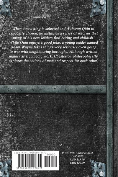 When a new king is selected and Auberon Quin is randomly chosen, he institutes a series of reforms that many of his new leaders find boring and childish. While Quin enjoys a good joke, a young leader named Adam Wayne takes things very seriously even going to war with neighbouring boroughs. Although written mainly as a comedic work, Chesterton philosophically explores the actions of man and respect for each other.