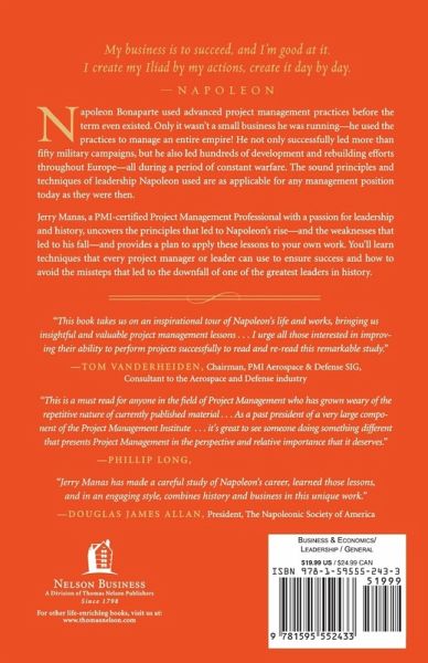 What is it about Napoleon Bonaparte that has led recognized leaders such as General George S. Patton to study his principles and inspired countless books on management and leadership to quote his maxims? Napoleon on Project Management explores the key principles behind this great historic leader's successes to provide project managers the recipe for managing commitments and propelling their teams to victory. You'll learn how to: leverage timeless wisdom to improve your project performance; prepare your team for battle through superior communication skills; apply Napoleon-level research, record-keeping, and organization methods to each of your projects; and gain an upper hand by understanding and leveraging the complex and essential dynamic between project management and strategic leadership. Who says history shouldn't repeat itself? By exploring the leadership strategies that stand the test of time and learning how to avoid the triggers that ultimately lead to Napoleon's downfall, you'll learn how to strengthen and reinvigorate your modern-day project management practices, conquer every challenge, and help your organization grow and thrive.