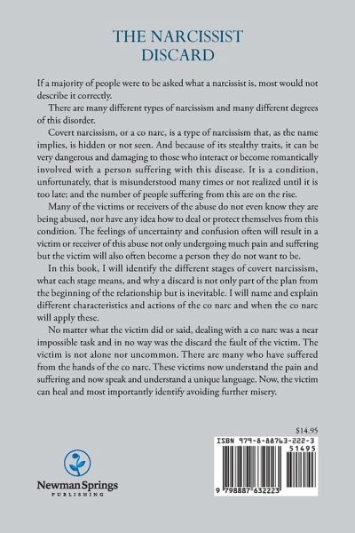 If a majority of people were to be asked what a narcissist is, most would not describe it correctly. There are many different types of narcissism and many different degrees of this disorder. Covert narcissism, or a co narc, is a type of narcissism that, as the name implies, is hidden or not seen. And because of its stealthy traits, it can be very dangerous and damaging to those who interact or become romantically involved with a person suffering with this disease. It is a condition, unfortunately, that is misunderstood many times or not realized until it is too late; and the number of people suffering from this are on the rise. Many of the victims or receivers of the abuse do not even know they are being abused, nor have any idea how to deal or protect themselves from this condition. The feelings of uncertainty and confusion often will result in a victim or receiver of this abuse not only undergoing much pain and suffering but the victim will also often become a person they do not want to be. In this book, I will identify the different stages of covert narcissism, what each stage means, and why a discard is not only part of the plan from the beginning of the relationship but is inevitable. I will name and explain different characteristics and actions of the co narc and when the co narc will apply these. No matter what the victim did or said, dealing with a co narc was a near impossible task and in no way was the discard the fault of the victim. The victim is not alone nor uncommon. There are many who have suffered from the hands of the co narc. These victims now understand the pain and suffering and now speak and understand a unique language. Now, the victim can heal and most importantly identify avoiding further misery.