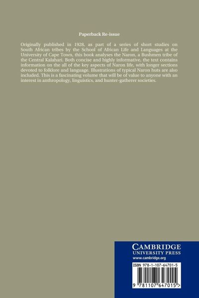 Originally published in 1928, as part of a series of short studies on South African tribes by the School of African Life and Languages at the University of Cape Town, this book analyses the Naron, a Bushmen tribe of the Central Kalahari. Both concise and highly informative, the text contains information on the all of the key aspects of Naron life, with longer sections devoted to folklore and language. Illustrations of typical Naron huts are also included. This is a fascinating volume that will be of value to anyone with an interest in anthropology, linguistics, and hunter-gatherer societies.