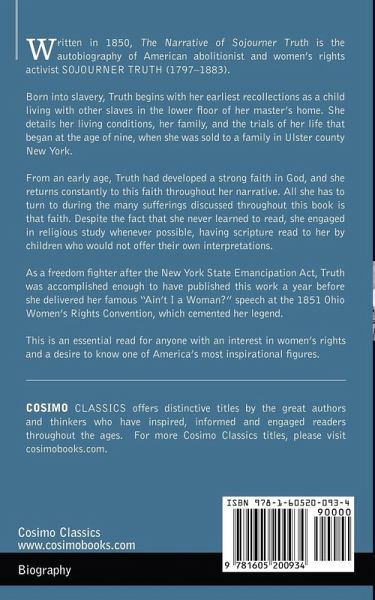 Written in 1850, The Narrative of Sojourner Truth is the autobiography of American abolitionist and women's rights activist SOJOURNER TRUTH (1797-1883). Born into slavery, Truth begins with her earliest recollections as a child living with other slaves in the lower floor of her master's home. She details her living conditions, her family, and the trials of her life that began at the age of nine, when she was sold to a family in Ulster county New York. From an early age, Truth had developed a strong faith in God, and she returns constantly to this faith throughout her narrative. All she has to turn to during the many sufferings discussed throughout this book is that faith. Despite the fact that she never learned to read, she engaged in religious study whenever possible, having scripture read to her by children who would not offer their own interpretations. As a freedom fighter after the New York State Emancipation Act, Truth was accomplished enough to have published this work a year before she delivered her famous "Ain't I a Woman?" speech at the 1851 Ohio Women's Rights Convention, which cemented her legend.
