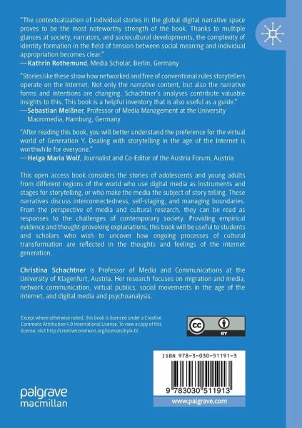 This open access book considers the stories of adolescents and young adults from different regions of the world who use digital media as instruments and stages for storytelling, or who make the media the subject of story telling. These narratives discuss interconnectedness, self-staging, and managing boundaries. From the perspective of media and cultural research, they can be read as responses to the challenges of contemporary society. Providing empirical evidence and thought-provoking explanations, this book will be useful to students and scholars who wish to uncover how ongoing processes of cultural transformation are reflected in the thoughts and feelings of the internet generation.