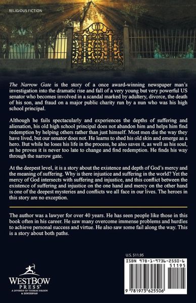 The Narrow Gate is the story of a once award-winning newspaper man's investigation into the dramatic rise and fall of a very young but very powerful US senator who becomes involved in a scandal marked by adultery, divorce, the death of his son, and fraud on a major public charity run by a nun who was his high school principal. Although he fails spectacularly and experiences the depths of suffering and alienation, his old high school principal does not abandon him and helps him find redemption by helping others rather than just himself. Most men die the way they have lived, but our senator does not. He learns to shed his old skin and emerge as a hero. But while he loses his life in the process, he also saves it, as well as his soul, as he proves it is never too late to change and find redemption. He finds his way through the narrow gate. At the deepest level, it is a story about the existence and depth of God's mercy and the meaning of suffering. Why is there injustice and suffering in the world? Yet the mercy of God intersects with suffering and injustice, and this conflict between the existence of suffering and injustice on the one hand and mercy on the other hand is one of the deepest mysteries and conflicts we all face in our lives. The heroes in this story are no exception.