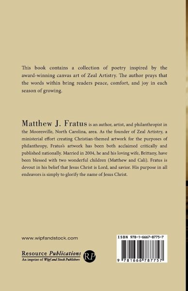 This book contains a collection of poetry inspired by the award-winning canvas art of Zeal Artistry. The author prays that the words within bring readers peace, comfort, and joy in each season of growing.