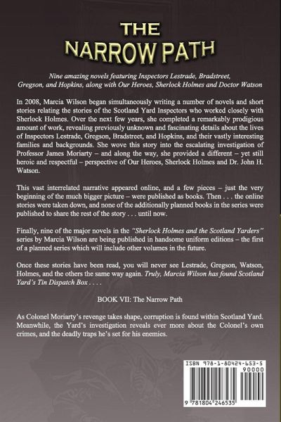 Nine amazing novels featuring Inspectors Lestrade, Bradstreet, Gregson, and Hopkins, along with Our Heroes, Sherlock Holmes and Doctor Watson In 2008, Marcia Wilson began simultaneously writing a number of novels and short stories relating the stories of the Scotland Yard Inspectors who worked closely with Sherlock Holmes. Over the next few years, she completed a remarkably prodigious amount of work, revealing previously unknown and fascinating details about the lives of Inspectors Lestrade, Gregson, Bradstreet, and Hopkins, and their vastly interesting families and backgrounds. She wove this story into the escalating investigation of Professor James Moriarty - and along the way, she provided a different - yet still heroic and respectful - perspective of Our Heroes, Sherlock Holmes and Dr. John H. Watson. This vast interrelated narrative appeared online, and a few pieces - just the very beginning of the much bigger picture - were published as books. Then . . . the online stories were taken down, and none of the additionally planned books in the series were published to share the rest of the story . . . until now. Finally, nine of the major novels in the "Sherlock Holmes and the Scotland Yarders" series by Marcia Wilson are being published in handsome uniform editions - the first of a planned series which will include other volumes in the future. Once these stories have been read, you will never see Lestrade, Gregson, Watson, Holmes, and the others the same way again. Truly, Marcia Wilson has found Scotland Yard's Tin Dispatch Box... BOOK VII: The Narrow Path As Colonel Moriarty's revenge takes shape, corruption is found within Scotland Yard. Meanwhile, the Yard's investigation reveals ever more about the Colonel's own crimes, and the deadly traps he's set for his enemies.