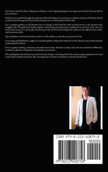 The book is written by Shane Marquin van Rooyen. A true inspirational guide once again instructed by God, just like his previous books. The book was assembled through the inspiration of the Holy Spirit, true testimonies, revelation and prayer. This book is based on the Cristian life in general, The Christian families, how to walk by spirit in faith in life. It is a complete guidance to all Christians how to manage. In this book the reader can find answers to the questions they struggled with. The quide keep families together and it brings restoration, peace, healing and so much joy to the soul. It is about God's concern over the people who belong to Him, In this book God guid the reader into the right direction of life, and the promise of life. It gives guidance and instructions how to survive in life and how to enter the true promise of God. It encourage and build faith to a higher level and through the reading of this book, the words is about to active the the spiritual awakening of the believer. It act as a guide, a healing, a restoration and a deliverance matter. This book is unique and can be use at churches in Bible class, at schools, in libraries, at hospitals, in households, at universities . PIt is nothing but what God want us to be in the time and age we are living, before His second coming, a preparation to stand in pure holiness before His throne. The encouragement is to keep your family in a safe place by this book.