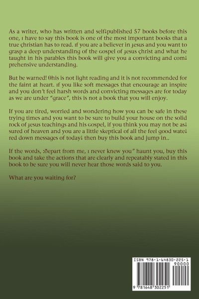 As a writer, who has written and self-published 57 books before this one, I have to say this book is one of the most important books that a true Christian has to read. If you are a believer in Jesus and you want to grasp a deep understanding of the Gospel of Jesus Christ and what he taught in his parables this book will give you a convicting and comprehensive understanding.But be warned! This is not light reading and it is not recommended for the faint at heart. If you like soft messages that encourage an inspire and you don't feel harsh words and convicting messages are for today as we are under "grace", this is not a book that you will enjoy.If you are tired, worried and wondering how you can be safe in these trying times and you want to be sure to build your house on the solid rock of Jesus teachings and his Gospel, if you think you may not be assured of heaven and you are a little skeptical of all the feel good watered down messages of today- then buy this book and jump in..If the words, :Depart from me, I never knew you" haunt you, buy this book and take the actions that are clearly and repeatably stated in this book to be sure you will never hear those words said to you.What are you waiting for?