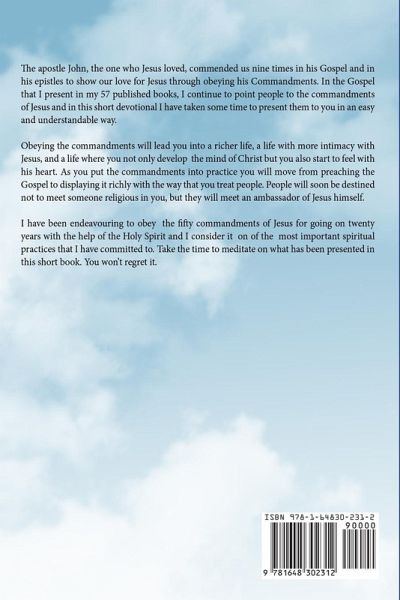 The apostle John, the one who Jesus loved, commended us nine times in his Gospel and in his epistles to show our love for Jesus through obeying his Commandments. In the Gospel that I present in my 57 published books, I continue to point people to the commandments of Jesus and in this short devotional I have taken some time to present them to you in an easy and understandable way.Obeying the commandments will lead you into a richer life, a life with more intimacy with Jesus, and a life where you not only develop the mind of Christ but you also start to feel with his heart. As you put the commandments into practice you will move from preaching the Gospel to displaying it richly with the way that you treat people. People will soon be destined not to meet someone religious in you, but they will meet an ambassador of Jesus himself.I have been endeavouring to obey the fifty commandments of Jesus for going on twenty years with the help of the Holy Spirit and I consider it on of the most important spiritual practices that I have committed to. Take the time to meditate on what has been presented in this short book. You won't regret it.