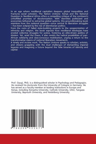 In an age where neoliberal capitalism deepens global inequalities and fractures social cohesion, The Nation Undone: Kenya and the National Question in Neoliberal Africa offers a compelling critique of the continent's unfulfilled promises of decolonization. With identities politicized and economies tethered to extractive global systems, this groundbreaking book examines how the national question-once central to liberation struggles-has been eclipsed by the rise of identitarian politics.From the ruins of failed state-building projects to the weaponization of ethnicity and religion, the book exposes how neoliberal ideologies have eroded collective struggles for justice, fostering an elite-driven politics of division. Yet, amid the chaos, it also revisits the radical possibilities of pan-African solidarity and class-conscious mobilization, urging a return to the transformative visions of national liberation movements.A timely and incisive work, The Nation Undone speaks to scholars, activists, and citizens grappling with the dual challenges of dismantling imperial legacies and imagining a future beyond the false binaries of identity and capital.