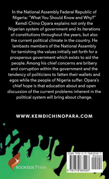 In the National Assembly Federal Republic of Nigeria: "What You Should Know and Why?" Kemdi Chino Opara explains not only the Nigerian system of government and its iterations of constitutions throughout the years, but also the current political climate in the country. He lambasts members of the National Assembly for tarnishing the values initially set forth for a prosperous government which exists to aid the people. Among his chief concerns are bribery and corruption within the government and the tendency of politicians to fatten their wallets and egos while the people of Nigeria suffer. Opara's chief hope is that education about and open discussion of the current problems inherent in the political system will bring about change.