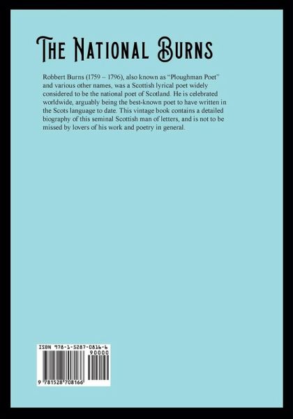 Robert Burns (1759 ¿ 1796), also known as ¿Ploughman Poet¿ and various other names, was a Scottish lyrical poet widely considered to be national poet of Scotland. This vintage book contains a detailed biography of this seminal Scottish man of letters, and is not to be missed by lovers of his work and poetry in general. Notable poems by Burns include: "A Red, Red Rose", "A Man's a Man for A' That", "To a Louse", "To a Mouse", and many more. Contents include: ¿Burns The Boy¿, ¿Burns the Youth¿, ¿Burns in the Nadir¿, ¿Burns as a Man, Lovers, Conversationalist, and Religionist¿, etc. Robbert Burns (1759 ¿ 1796), also known as ¿Ploughman Poet¿ and various other names, was a Scottish lyrical poet widely considered to be the national poet of Scotland. He is celebrated worldwide, arguably being the best-known poet to have written in the Scots language to date. Many vintage books such as this are increasingly scarce and expensive. It is with this in mind that we are republishing this volume now in a new, affordable, modern edition complete with a specially-commissioned new introduction on the history of poetry.