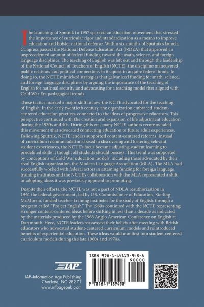 The launching of Sputnik in 1957 sparked an education movement that stressed the importance of curricular rigor and standardization as a means to improve education and bolster national defense. Within six months of Sputnik's launch, Congress passed the National Defense Education Act (NDEA) that approved an unprecedented amount of federal funding toward the math, science, and foreign language disciplines. The teaching of English was left out and through the leadership of the National Council of Teachers of English (NCTE), the discipline maneuvered public relations and political connections in its quest to acquire federal funds. In doing so, the NCTE mimicked strategies that galvanized funding for math, science, and foreign language disciplines by arguing the importance of the teaching of English for national security and advocating for a teaching model that aligned with Cold War Era pedagogical trends. These tactics marked a major shift in how the NCTE advocated for the teaching of English. In the early twentieth century, the organization embraced student-centered education practices connected to the ideas of progressive educators. This perspective continued with the creation and expansion of life adjustment education during the 1930s and 40s. During this era, many NCTE authors recommended this movement that advocated connecting education to future adult experiences. Following Sputnik, NCTE leaders supported content-centered reforms. Instead of curriculum recommendations based in discovering and fostering relevant student experiences, the NCTE's focus became adjusting student learning to predefined skills it thought all students should possess. This trend was supported by conceptions of Cold War education models, including those advocated by their rival English organization, the Modern Language Association (MLA). The MLA had successfully worked with federal actors in attaining funding for foreign language training institutes and the NCTE's collaboration with the MLA represented a shift in adopting ideas it was previously opposed to promoting. Despite their efforts, the NCTE was not a part of NDEA reauthorization in 1961 the federal government, led by U.S. Commissioner of Education, Sterling McMurrin, funded teacher-training institutes for the study of English through a program called "Project English." The 1960s continued with the NCTE representing stronger content-centered ideas before shifting in less than a decade as indicated by the materials produced by the 1966 Anglo American Conference on English at Dartmouth. Here, NCTE leaders reassessed their beliefs after meeting with British educators who advocated student-centered curriculum models and reintroduced benefits of experiential education. These ideas would manifest into student centered curriculum models during the late 1960s and 1970s.