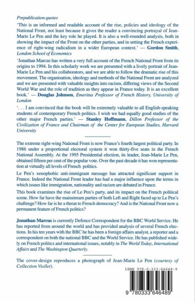 'Jonathan Marcus...stands out from most of his colleagues in the media by making a case for the non-alarmists. His National Front and French Politics is a throughtful study, which in the end, provides a more effective refutation of the myths peddled by Le Pen than would an angry pamphlet.' - Henri Astier, Times Literary Supplement `Jonathan Marcus's comprehensive account provides plenty of analysis to go with the factual background to the rise of Le Pen and the NF. There are particularly good chapters on the many strands of far-right opinion, from collaborators to extreme Catholics who eventually found a home with the new party.' - Andrew Bell, BBC Worldwide 'I am convinced that the book will be extremely valuable to all English-speaking students of contemporary French politics.' - Stanley Hoffmann, Harvard University The extreme right-wing National Front is now France's fourth largest political party. At the 1988 Presidential election, its leader Jean-Marie Le Pen obtained over 14 per cent of the popular vote. Le Pen's xenophobic anti-immigrant message has attracted significant support in France. This book examines the rise of Le Pen's party, and its impact on the French political scene. How far is it a threat to French democracy? And is the National Front now a permanent feature of French politics?