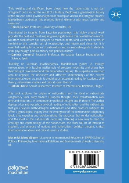 This book explores the origins of nationalism and the ideal of nation/state congruency since early-modern European thought, their transformation over time and endurance in contemporary political thought and IR theory. The author deploys a Lacanian-psychoanalytical reading of nationalism and the nation/state that goes beyond methodological nationalism and state-centrism critiques. He offers a genealogical inquiry into the emergence of the nation/state congruency ideal, thus exposing and problematising the practices that render nationalism and the ideal of the nation/state necessary. Offering a new way to read the ontology and epistemology of the nation/state, this work will be of interest to students and scholars of nations and nationalism, political thought, critical international relations and critical security studies.