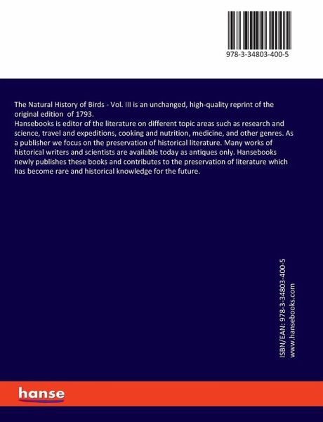 The Natural History of Birds - Vol. III is an unchanged, high-quality reprint of the original edition of 1793.Hansebooks is editor of the literature on different topic areas such as research and science, travel and expeditions, cooking and nutrition, medicine, and other genres. As a publisher we focus on the preservation of historical literature. Many works of historical writers and scientists are available today as antiques only. Hansebooks newly publishes these books and contributes to the preservation of literature which has become rare and historical knowledge for the future.