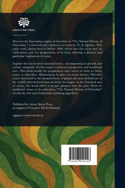 Discover the fascinating origins of chocolate in "The Natural History of Chocolate," a meticulously reprinted account by D. de Quelus. This early work, dating back to before 1800, delves into the cacao tree, its cultivation, and the preparation of its fruit, offering a distinct and particular exploration of cocoa. Explore the cocoa-tree's natural history, encompassing its growth and culture alongside the beverage's celebrated properties and medicinal uses. This book details the preparation and virtues of what we know today as chocolate, illuminating its place in social history. Whether you're interested in the natural history of plants, the story behind one of the world's most beloved non-alcoholic beverages, or the historical uses of cacao, this book offers a unique glimpse into the past. From its medicinal virtues to its cultivation, "The Natural History of Chocolate" reveals the rich story behind this enduring ingredient. This work has been selected by scholars as being culturally important, and is part of the knowledge base of civilization as we know it. This work is in the public domain in the United States of America, and possibly other nations. Within the United States, you may freely copy and distribute this work, as no entity (individual or corporate) has a copyright on the body of the work. Scholars believe, and we concur, that this work is important enough to be preserved, reproduced, and made generally available to the public. We appreciate your support of the preservation process, and thank you for being an important part of keeping this knowledge alive and relevant.