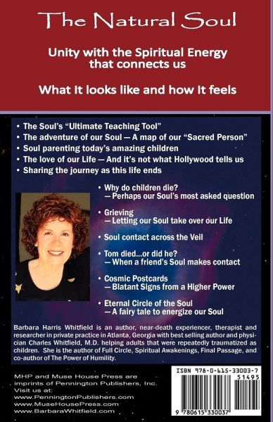 The Natural Soul: Unity with the Spiritual Energy that Connects Us ¿ What It looks like and how It feels The central concept of The Natural Soul is the difference between ego, the character we play in our daily drama, and who we really are ¿ our soul or True Self. This book overflows with intimate vignettes that bring these ideas alive. Whitfield tackles head-on our current epidemic of spiritual and societal malaise and our overuse of prescription medication which usually numbs us to our soul. Our ego may struggle to understand but as we read we awaken to what our soul innately knows ¿ We came here as souls born into a human body and we will leave again as our soul. She uses this new way of seeing our life in other areas including: the love of our life, raising children, grieving naturally instead of numbing out in ¿depression,¿ helping others die, facing our own final passage in this life time and soul contact across the veil. The Natural Soul, Whitfield's fifth published book, offers us our souls' natural birth right ¿a life of peace and joy. Previous books have garnered her appearances on Oprah, Larry King, Donahue, the U.S. Senate and U.N. in New York.