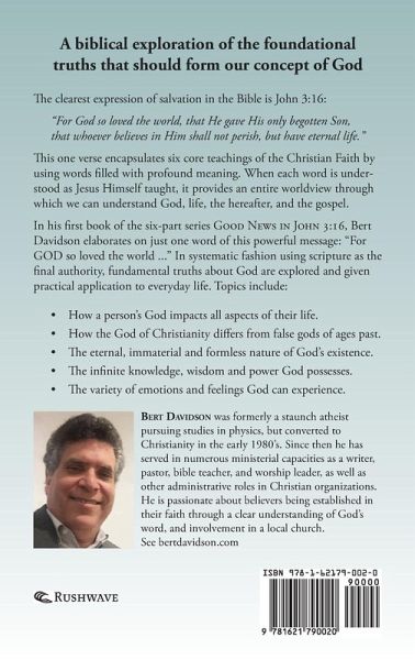 A BIBLICAL EXPLORATION OF THE FOUNDATIONAL TRUTHS THAT SHOULD FORM OUR CONCEPT OF GOD. The clearest expression of salvation in the Bible is John 3:16: "For God so loved the world, that He gave His only begotten Son, that whoever believes in Him shall not perish, but have eternal life." This one verse encapsulates six core teachings of the Christian Faith by using words filled with great depth and meaning. When each word is understood as Jesus Himself taught, it provides an entire worldview through which we can understand God, life, the hereafter, and the gospel. In his first book of the six-part series Good News in John 3:16, Bert Davidson elaborates on just one word of this powerful message: "For GOD so loved the world ..." In systematic fashion using scripture as the final authority, fundamental truths about God are explored and given practical application to everyday life. Topics include:How a person's God impacts all aspects of their life. How the God of Christianity differs from false gods of ages past. The eternal, immaterial and formless nature of God's existence. The infinite knowledge, wisdom and power God possesses. The variety of emotions and feelings God can experience.