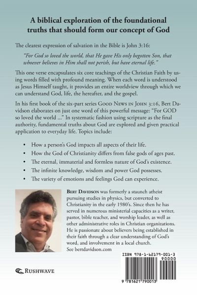 A BIBLICAL EXPLORATION OF THE FOUNDATIONAL TRUTHS THAT SHOULD FORM OUR CONCEPT OF GOD. The clearest expression of salvation in the Bible is John 3:16: "For God so loved the world, that He gave His only begotten Son, that whoever believes in Him shall not perish, but have eternal life." This one verse encapsulates six core teachings of the Christian Faith by using words filled with great depth and meaning. When each word is understood as Jesus Himself taught, it provides an entire worldview through which we can understand God, life, the hereafter, and the gospel. In his first book of the six-part series Good News in John 3:16, Bert Davidson elaborates on just one word of this powerful message: "For GOD so loved the world ..." In systematic fashion using scripture as the final authority, fundamental truths about God are explored and given practical application to everyday life. Topics include:How a person's God impacts all aspects of their life. How the God of Christianity differs from false gods of ages past. The eternal, immaterial and formless nature of God's existence. The infinite knowledge, wisdom and power God possesses. The variety of emotions and feelings God can experience.