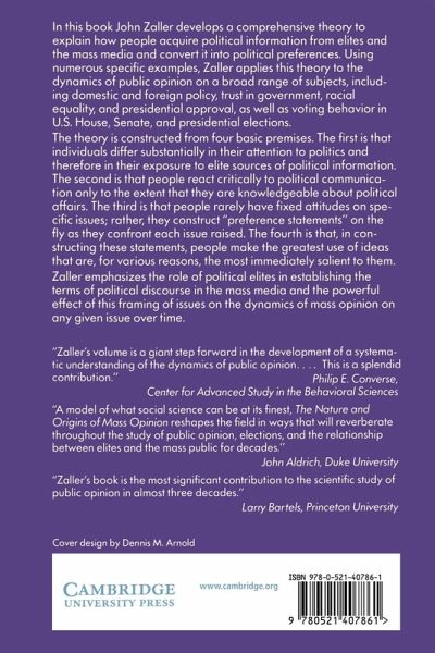 In this book John Zaller develops a comprehensive theory to explain how people acquire political information from the mass media and convert it into political preferences. Using numerous specific examples, Zaller applies this theory in order to explain the dynamics of public opinion on a broad range of subjects, including both domestic and foreign policy, trust in government, racial equality, and presidential approval, as well as voting behavior in U.S. House, Senate and Presidential elections. Particularly perplexing characteristics of public opinion are also examined, such as the high degree of random fluctuations in political attitudes observed in opinion surveys and the changes in attitudes due to minor changes in the wording of survey questions.