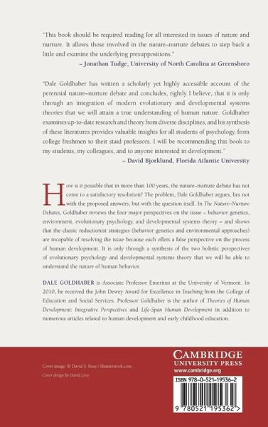 How is it possible that in more than one hundred years, the nature-nurture debate has not come to a satisfactory resolution? The problem, Dale Goldhaber argues, lies not with the proposed answers, but with the question itself. In The Nature-Nurture Debate, Goldhaber reviews the four major perspectives on the issue - behavior genetics, environment, evolutionary psychology and developmental systems theory - and shows that the classic, reductionist strategies (behavior genetics and environmental approaches) are incapable of resolving the issue because they each offer a false perspective on the process of human development. It is only through a synthesis of the two holistic perspectives of evolutionary psychology and developmental systems theory that we will be able to understand the nature of human behavior.