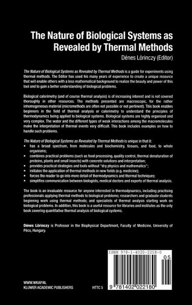The Nature of Biological Systems as Revealed by Thermal Methods is a guide for experiments using thermal methods. The Editor has used his many years of experience to create a unique resource that will enable others with a less mathematical background, to realize the beauty and power of this tool and to gain a better understanding of biological problems.