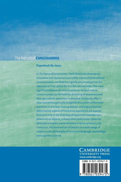 In The Nature of Consciousness, Mark Rowlands develops an innovative and radical account of the nature of phenomenal consciousness, one that has significant consequences for attempts to find a place for it in the natural order. The most significant feature of consciousness is its dual nature: consciousness can be both the directing of awareness and that upon which awareness is directed. Rowlands offers a clear and philosophically insightful discussion of the main positions in this fast-moving debate, and argues that the phenomenal aspects of conscious experience are aspects that exist only in the directing of experience towards non-phenomenal objects, a theory that undermines reductive attempts to explain consciousness in terms of what is not conscious. His book will be of interest to a wide range of readers in the philosophy of mind and language, psychology, and cognitive science.