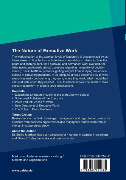More than 30 years ago, Henry Mintzberg reported on upper level management in large US corporations. His resulting work, "The Nature of Managerial Work", - ceived much attention. Expanding on earlier research, Mintzberg's 1973 study was able to show that the work situation at the topmost levels of leadership is charact- ized by extreme stress; critical factors include the accountability to others such as the board and shareholders, time pressure, and permanent work overload, the latter ra- ing particularly critical questions regarding the quality of decision making - a sign- icant risk for the long-term survival of organizations. In today's economic crisis - which is at the same time a crisis of the management profession as a whole - the research focus and results of Henry Mintzberg's study are more relevant than ever. Rigorous studies in the field, however, are still rare. In the present research study, "The Nature of Executive Work", Emilio Matthaei builds on and reaches far beyond the earlier works of the so-called Work Activity School of management research (e. g. Sune Carlson, Leonard Sayles, Rosemary Stewart, Henry Mintzberg, Ralf Reichwald and John Kotter). His exploratory journey from intensively studying twelve senior executives of large global corporations int- duces a fresh perspective on executive work. Emilio Matthaei's data cover the work of twelve executives of the uppermost level of large organizations, each for one month using calendar transcripts and interview records.