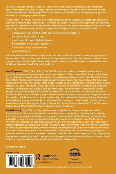 It is the first of its kind, co-written by an occupational therapist and landscape architect both with proven expertise in inclusive play space design. The Nature of Inclusive Play fills an untapped niche in promoting the value of outdoor play. It focuses on what embodies play and shows how, through inclusive outdoor play design, developmental skills can be enriched. The topics covered in the book include: a discussion of the health benefits associated with being outdoorsthe history of and value of playan overview of typical child developmentthe importance of sensory regulationan inclusive design review processdesign guidelines. All topics are supplemented with nine applicable case studies of inclusive outdoor play spaces with features that reflect inclusive+ principles, including examples from North America and Africa. It is a much-needed guide for landscape architects, urban planners, allied health care professionals, early childhood educators, academics, and students.
