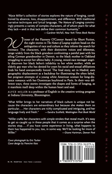The eight stories in The Nature of Longing move beyond conventional boundaries of race and gender to explore the universal desire to belong. Avoiding easy answers, Alyce Miller probes the overlapping worlds of blacks, whites, gays, and straights, all caught in the ordinary human struggle to connect with parents, spouses, lovers, friends, and children. In the title story, a gay librarian in upstate New York is cruelly outed but finds comfort in the letter of a man he's never met. In "Color Struck," a black mother in East Oakland struggles with her inability to name, and thus to accept, her albino daughter. In "Summer in Detroit," a black man, visiting his ailing white grandmother, is forced to relive a personal tragedy that occurred during the 1967 riots. The novella that closes the book, "Dead Women," examines a young American woman's search in Europe for romance that lasts beyond desire. Miller gives substance to her characters' poignant longing, which manifests itself in unexpected ways.