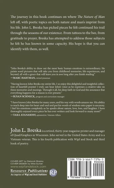 The journey in this book continues on where The Nature of Man left off, with poetic topics on both nature and man's imprint from his life. John L. Breska has picked pieces he felt continued his trail through the seasons of our existence. From tattoos to the bee, from gratitude to prayer, Breska has attempted to address those subjects he felt he has known in some capacity. His hope is that you can identify with them, as well.