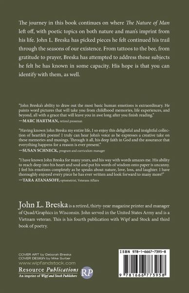 The journey in this book continues on where The Nature of Man left off, with poetic topics on both nature and man's imprint from his life. John L. Breska has picked pieces he felt continued his trail through the seasons of our existence. From tattoos to the bee, from gratitude to prayer, Breska has attempted to address those subjects he felt he has known in some capacity. His hope is that you can identify with them, as well.