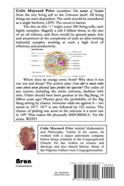 We need to rethink the way we consider life, physics and the universe, says scientist-theologian Colin M Price. All living things are inter-dependent. The earth should be considered as a single bioform, LIFE. Yet the moon is barren. The dot on this "i" might cover 200 living cells, each highly complex. Magnify a cell 2 billion times, to the size of an oil refinery, and it would cause panic and amazement at its complexity and productivity. Where does its energy come from? The author asks: How did so much order come about when physics predicts the opposite? The order of any system, including the entire universe, should decline with time. Order should have been greatest at the Big Bang, 14 billion years ago! The probability of the Big Bang arising by chance is one in 10 to the power of ten itself raised to the power of 123! Life on earth is IMPOSSIBLE. Yet life exists. WHY? Topics include: Can scientists create life from scratch? Why were the dinosaurs so big? Life is no accident! It's INTENDED!