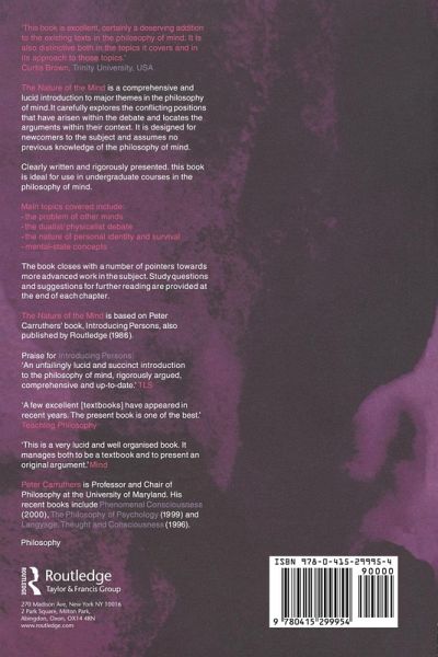 The Nature of the Mind is a comprehensive and lucid introduction to major themes in the philosophy of mind. It carefully explores the conflicting positions that have arisen within the debate and locates the arguments within their context. It is designed for newcomers to the subject and assumes no previous knowledge of the philosophy of mind. Clearly written and rigorously presented, this book is ideal for use in undergraduate courses in the philosophy of mind. Main topics covered include: * the problem of other minds * the dualist/physicalist debate * the nature of personal identity and survival * mental-state concepts The book closes with a number of pointers towards more advanced work in the subject. Study questions and suggestions for further reading are provided at the end of each chapter. The Nature of the Mind is based on Peter Carruthers' book, Introducing Persons, also published by Routledge (1986).