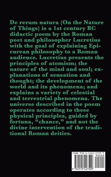 De rerum natura (On the Nature of Things) is a 1st century BC didactic poem by the Roman poet and philosopher Lucretius with the goal of explaining Epicurean philosophy to a Roman audience. Lucretius presents the principles of atomism; the nature of the mind and soul; explanations of sensation and thought; the development of the world and its phenomena; and explains a variety of celestial and terrestrial phenomena. The universe described in the poem operates according to these physical principles.