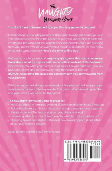 You don't have to be married to enjoy this sexy game for couples! In this deliciously naughty version of the classic Newlywed Game, you and your romantic partner have the chance to put your knowledge of each other's desires, passions, and sexual preferences to the test! Take turns guessing how your partner would answer various naughty questions. Do you know what really turns them on? Now's the time to find out! Get ready for a fun, easy, and very sexy quiz game that starts conversations about what turns your partner on both in and out of the bedroom. Discover exactly what your partner thinks about sexual fantasies, new sex positions, secret desires, and everything that leads to hot sex! BONUS: Answering the questions correctly earn you sexy rewards from your partner! Whether you're just dating, newlywed, or happily married, every couple wants an exciting and steamy sex life! This game is both revealing and fun, and your sex life will never be the same! The Naughty Newlywed Game is great for: · Hot Date night - A romantic evening of sexy conversation heats things up. · Rekindling Intimacy - Sexual discussion brings a couple closer together. · Vacation game - The two of you can play this anywhere! · Increasing attraction - You'll learn exactly what turns your partner on! · Opening sexual possibilities - Discover new sexual opportunities either of you may want to explore! It's the perfect sexy gift for him or her! Great gift idea for a birthday, anniversary honeymoon, Valentine's Day, Christmas, weddings, bridal shower, or bachelorette party! Make tonight a night they'll never forget!