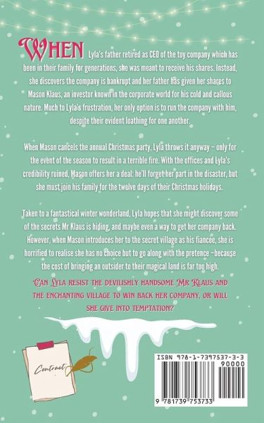 Most Popular Books On Netgalley in 2022 #1 in Romance #1 in New Adult #1 in Sci-fi/FantasyBeing Naughty Has Never Been So Nice! When Lyla's father retired as CEO of the toy company which has been in their family for generations, she was meant to receive his shares. Instead, she discovers the company is bankrupt and her father has given her shares to Mason Klaus, an investor known in the corporate world for his cold and callous nature. Much to Lyla's frustration, her only option is to run the company with him, despite their evident loathing for one another. When Mason cancels the annual Christmas party, Lyla throws it anyway - only for the event of the season to result in a terrible fire. With the offices and Lyla's credibility ruined, Mason offers her a deal: he'll forget her part in the disaster, but she must join his family for the twelve days of their Christmas holidays. Taken to a fantastical winter wonderland, Lyla hopes that she might discover some of the secrets Mr Klaus is hiding, and maybe even a way to get her company back. However, when Mason introduces her to the secret village as his fiancée, she is horrified to realise she has no choice but to go along with the pretence - because the cost of bringing an outsider to their magical land is far too high. Can Lyla resist the devilishly handsome Mr Klaus and the enchanting village to win back her company, or will she give into temptation? Readers who fell in love with Yule: 'Definitely a must-read for anyone who likes Christmas books with a beautiful touch of fantasy.' ¿¿¿¿¿ 'Magical. Felt like stepping into a snow globe Christmas village.' ¿¿¿¿¿ 'I'm a sucker for cheesy hallmark Christmas movies, so if you're like me you'll love this book!' ¿¿¿¿¿ 'Adventure, romance, a bit of spice, and a sprinkle of gold dust to put you in the holiday spirit!' ¿¿¿¿¿ 'Workplace rivals featuring Santa's hot son and forced proximity in the North Pole? Count me in.' ¿¿¿¿¿ Tropes & Themes: Low-Fantasy Romance Workplace, Enemies to Lovers Fake Engagement Forced Proximity Cosy, Christmas feels